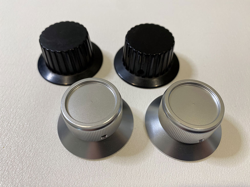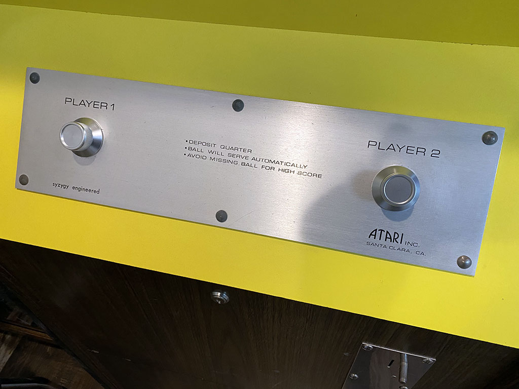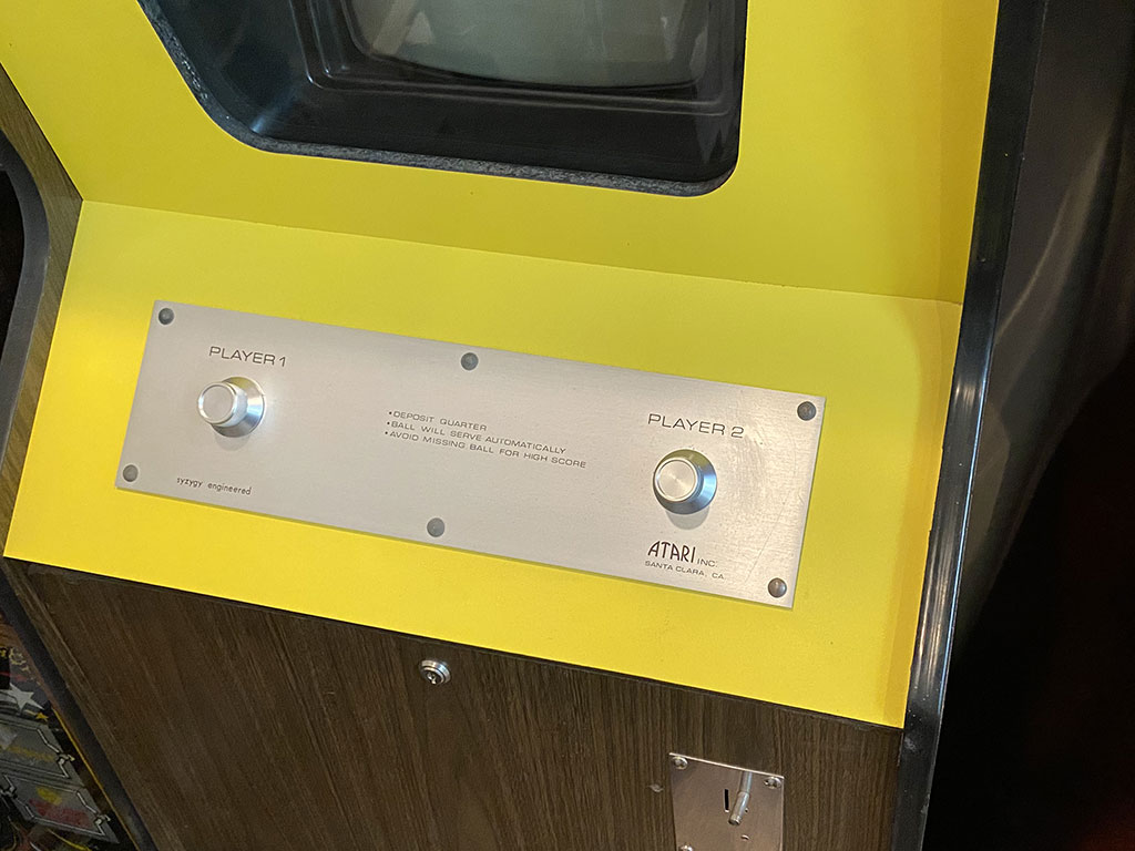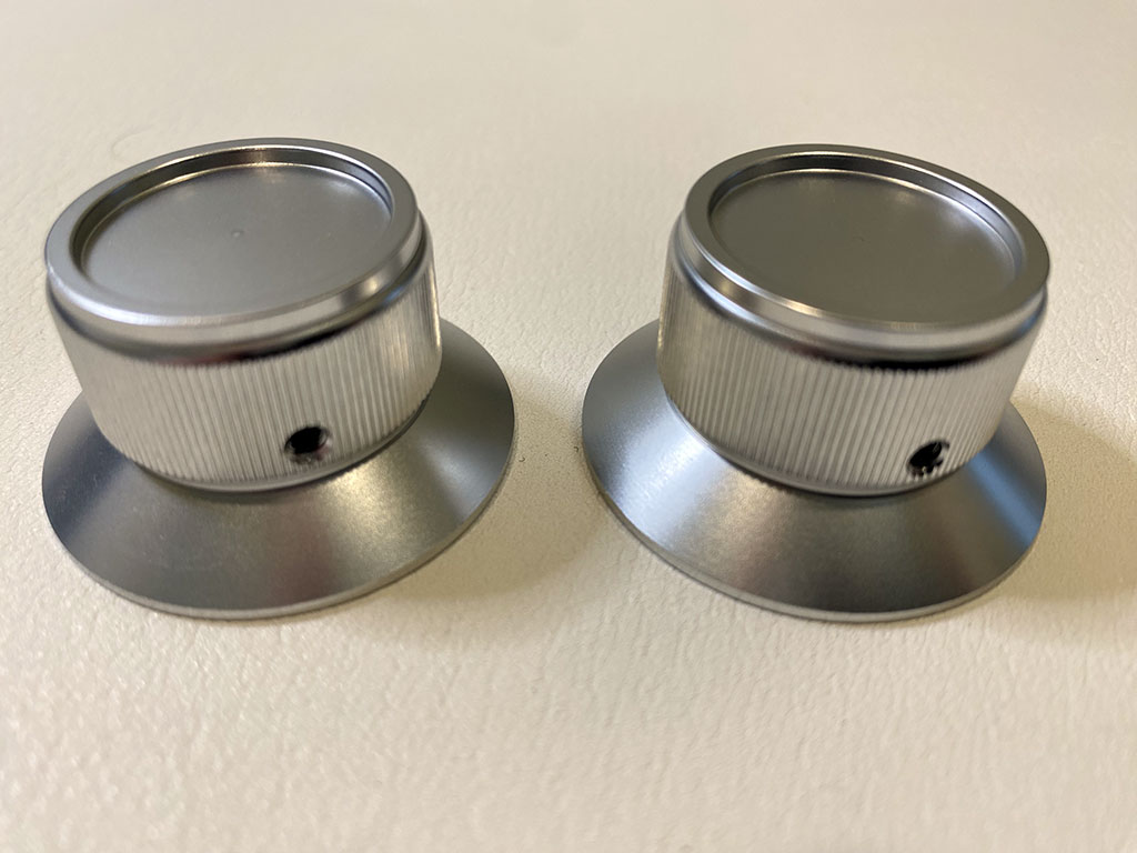 Given that the control panel is aluminum, it seems only fitting to remove the plastic knobs on my Pong cabinet and replace them with these beauties. Behold…